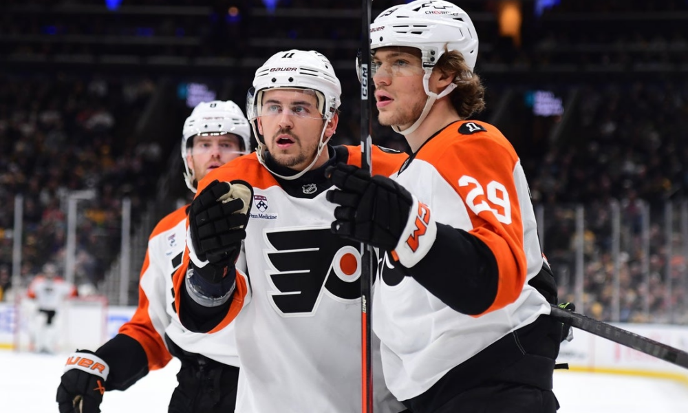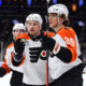 Jan 29, 2026; Boston, Massachusetts, USA; Philadelphia Flyers right wing Nikita Grebenkin (29) is congratulated by right wing Travis Konecny (11) after scoring a goal during...
