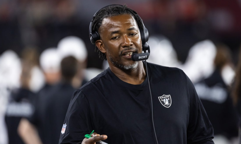 Aug 23, 2025; Glendale, Arizona, USA; Las Vegas Raiders defensive coordinator Patrick Graham against the Arizona Cardinals during a preseason NFL game at State Farm Stadium....