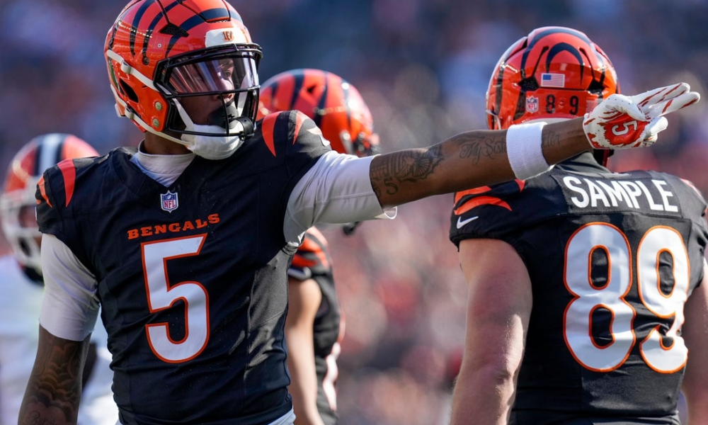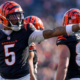 Cincinnati Bengals wide receiver Tee Higgins (5) celebrates a first down in the first quarter of the NFL Week 18 game between the Cincinnati Bengals and...