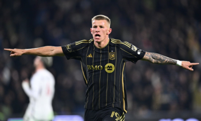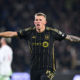 Nov 8, 2024; Los Angeles, California, USA; LAFC midfielder Mateusz Bogusz (19) celebrates after scoring a goal against Vancouver Whitecaps FC in the second half in...