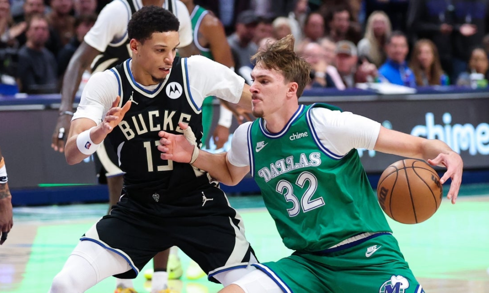 Nov 10, 2025; Dallas, Texas, USA; Dallas Mavericks forward Cooper Flagg (32) drives to the basket as Milwaukee Bucks guard Ryan Rollins (13) defends during the...