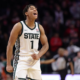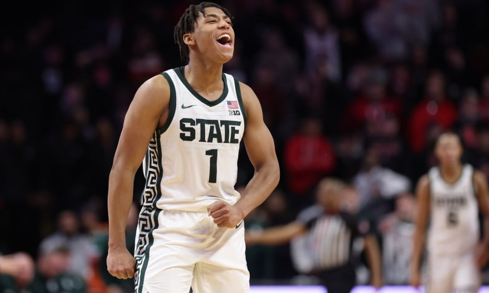 Jan 27, 2026; Piscataway, New Jersey, USA; Michigan State Spartans guard Jeremy Fears Jr. (1) reacts during overtime against the Rutgers Scarlet Knights at Jersey Mike’s...
