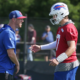 Bills quarterback Josh Allen talks with offensive coordinator Joe Brady during drills on day three of the Buffalo Bills training camp. Josh Allen was sporting crutches...