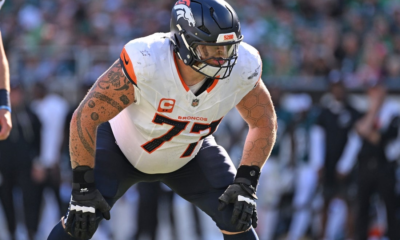 Oct 5, 2025; Philadelphia, Pennsylvania, USA; Denver Broncos guard Quinn Meinerz (77) against the Philadelphia Eagles at Lincoln Financial Field. Mandatory Credit: Eric Hartline-Imagn Images Two...