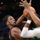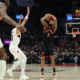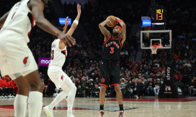 Jan 23, 2026; Portland, Oregon, USA; Toronto Raptors forward Brandon Ingram (3) shoots the ball over Portland Trail Blazers forward Toumani Camara (33) during the first...
