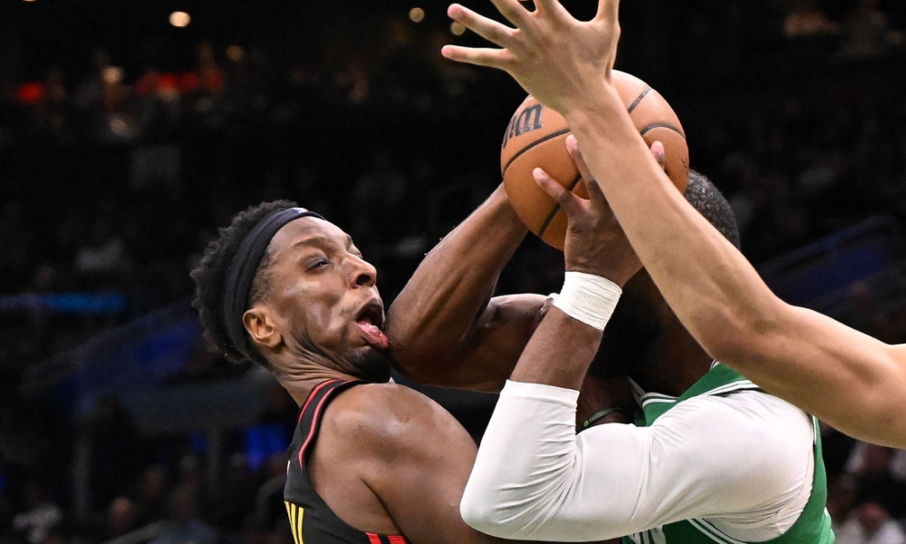 Jan 28, 2026; Boston, Massachusetts, USA; Atlanta Hawks forward Onyeka Okongwu (17) reacts after being hit in the jaw with an elbow by Boston Celtics guard...