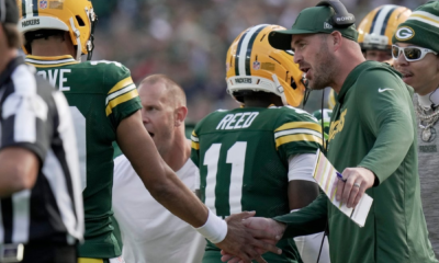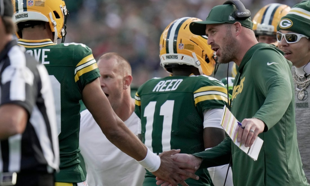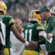Green Bay Packers quarterback coach Sean Mannion is shown congratulating quarterback Jordan Love (10) during the second quarter of their game Sunday, September 7, 2025 at...