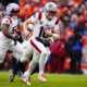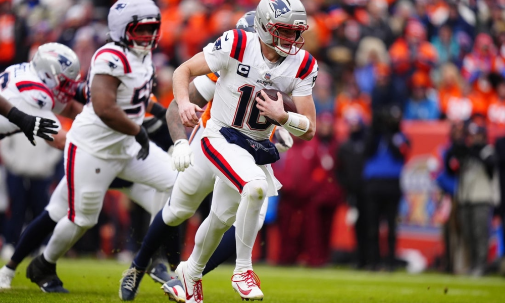 Jan 25, 2026; Denver, CO, USA; New England Patriots quarterback Drake Maye (10) rushes the ball for a touchdown against the Denver Broncos during the first...