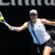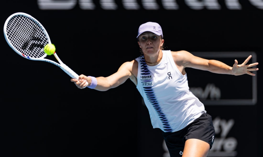 Jan 28, 2026; Melbourne, Victoria, Australia; Iga Swiatek of Poland in action against Elena Rybakina of Kazakhstan in the quarterfinals of the women’s singles at the...