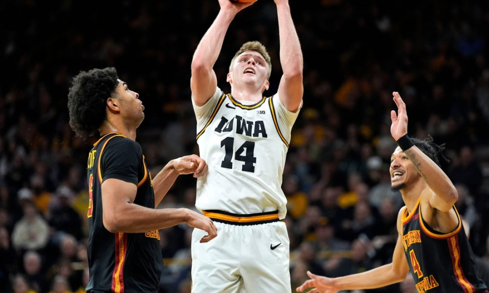 Iowa guard Bennett Stirtz (14) shoots the basketball against the USC Trojans Jan. 28, 2026 at Carver-Hawkeye Arena in Iowa City, Iowa. Bennett Stirtz capped a...