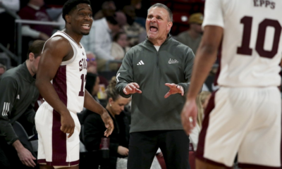 Jan 24, 2026; Starkville, Mississippi, USA; Mississippi State Bulldogs guard Josh Hubbard (12) and head coach Chris Jans react during the first half against the Vanderbilt...