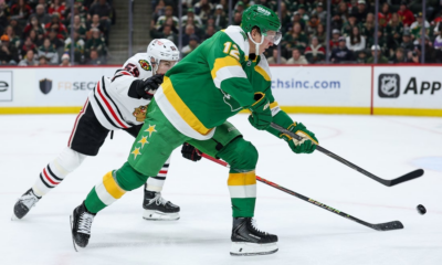 Jan 27, 2026; Saint Paul, Minnesota, USA; Minnesota Wild left wing Matt Boldy (12) shoots as Chicago Blackhawks defenseman Artyom Levshunov (55) defends during the second...