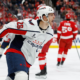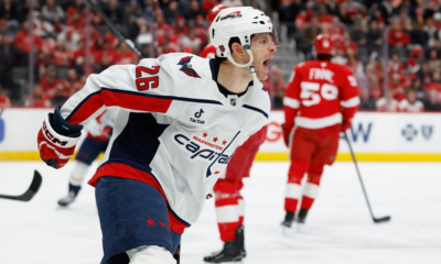 Jan 29, 2026; Detroit, Michigan, USA; Washington Capitals center Nic Dowd (26) celebrates after scoring in the first period against the Detroit Red Wings at Little...