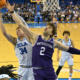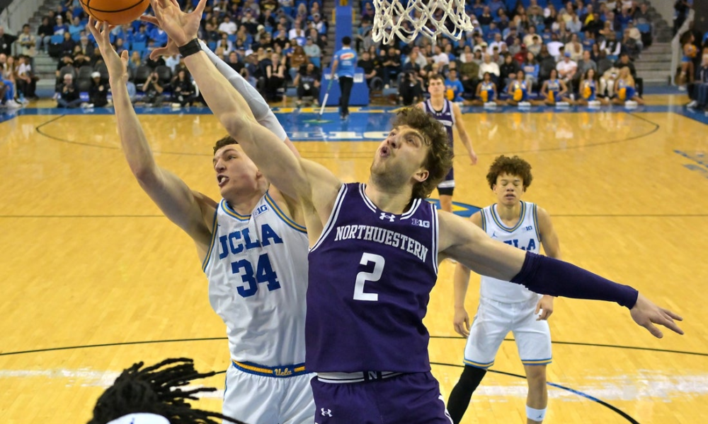 Jan 24, 2026; Los Angeles, California, USA; UCLA Bruins forward Tyler Bilodeau (34) and Northwestern Wildcats forward Nick Martinelli (2) go for a rebound in the...