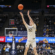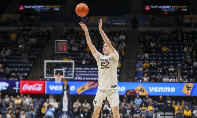 Jan 27, 2026; Morgantown, West Virginia, USA; West Virginia Mountaineers guard Treysen Eaglestaff (52) shoots during the second half against the Kansas State Wildcats at Hope...