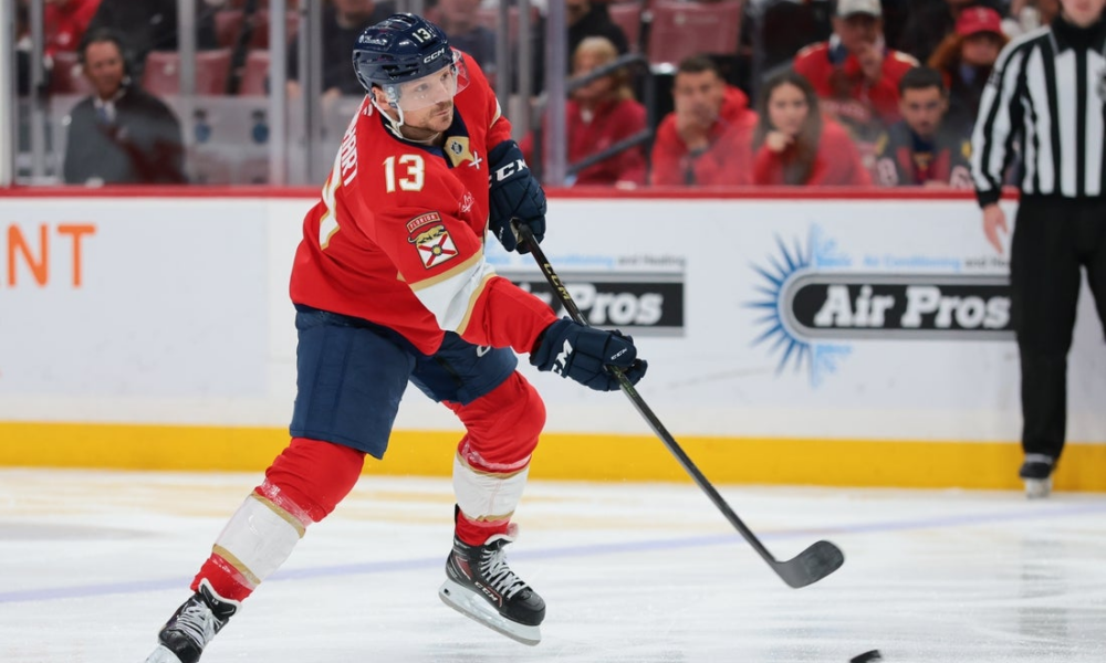 Jan 27, 2026; Sunrise, Florida, USA; Florida Panthers center Sam Reinhart (13) moves the puck against the Utah Mammoth during the third period at Amerant Bank...