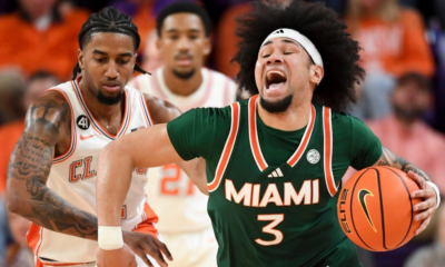 Clemson Tigers guard Dillon Hunter (2) defends Miami Hurricanes guard Tre Donaldson (3) Saturday, Jan. 17, 2026, during the NCAA men’s basketball game at Littlejohn Coliseum...