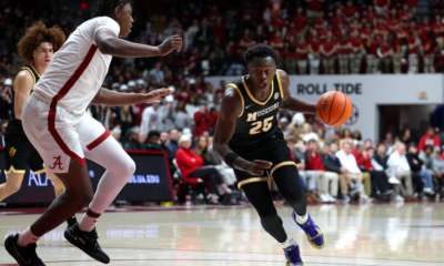 Jan 27, 2026; Tuscaloosa, Alabama, USA; Alabama Crimson Tide forward Aiden Sherrell (22) guards Missouri Tigers guard Mark Mitchell (25) during the first half at Coleman...