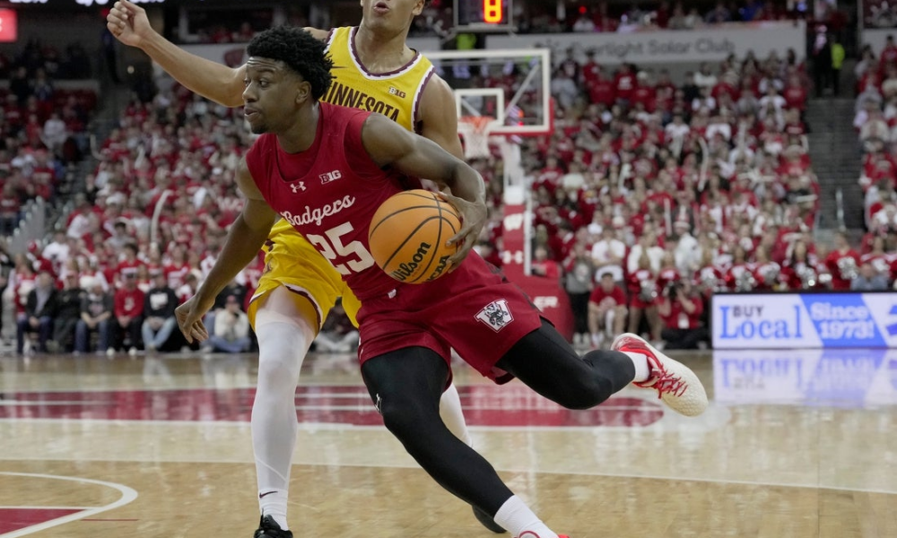 Wisconsin guard John Blackwell (25) turns the corner on Minnesota guard Isaac Asuma (1) during the second half of their game Wednesday, January 28, 2026 at...