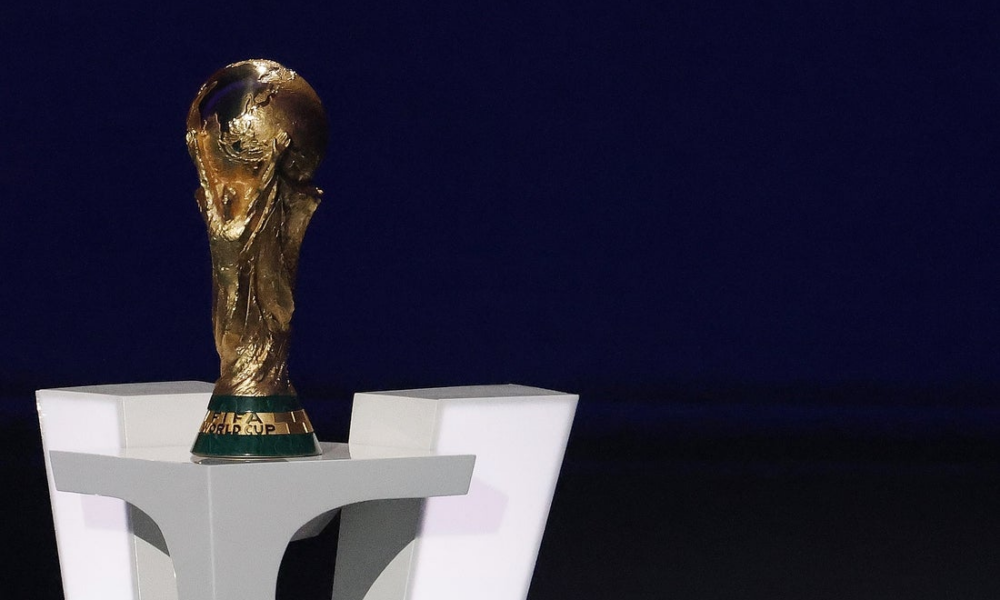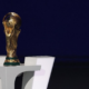 Dec 5, 2025; Washington, District of Columbia, USA; The World Cup trophy sits on a podium during the FIFA World Cup 2026 Final Draw at John...