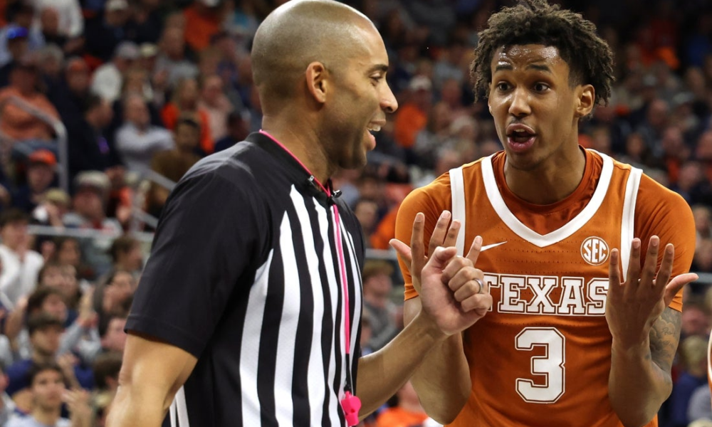 Jan 28, 2026; Auburn, Alabama, USA; Texas Longhorns forward Dailyn Swain (3) talks with a game official after being called for a foul against the Auburn...