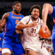 Jan 28, 2026; Columbia, South Carolina, USA; South Carolina Gamecocks forward Elijah Strong (31) attempts to driver around Florida Gators center Rueben Chinyelu (9) in the...