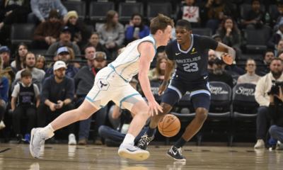 Jan 28, 2026; Memphis, Tennessee, USA; Charlotte Hornets guard Kon Knueppel (7) drives past defender Memphis Grizzlies forward Jalen Wells (0) in the first quarter at...