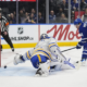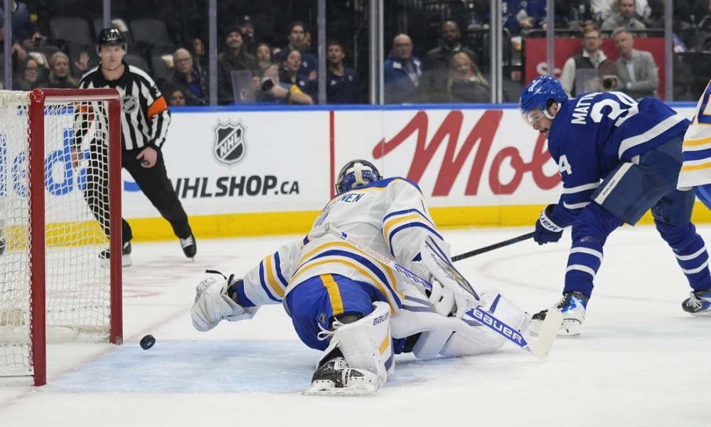 Jan 27, 2026; Toronto, Ontario, CAN; Toronto Maple Leafs forward Auston Matthews (34) scores on Buffalo Sabres goaltender Ukko-Pekka Luukkonen (1) during the first period at...