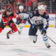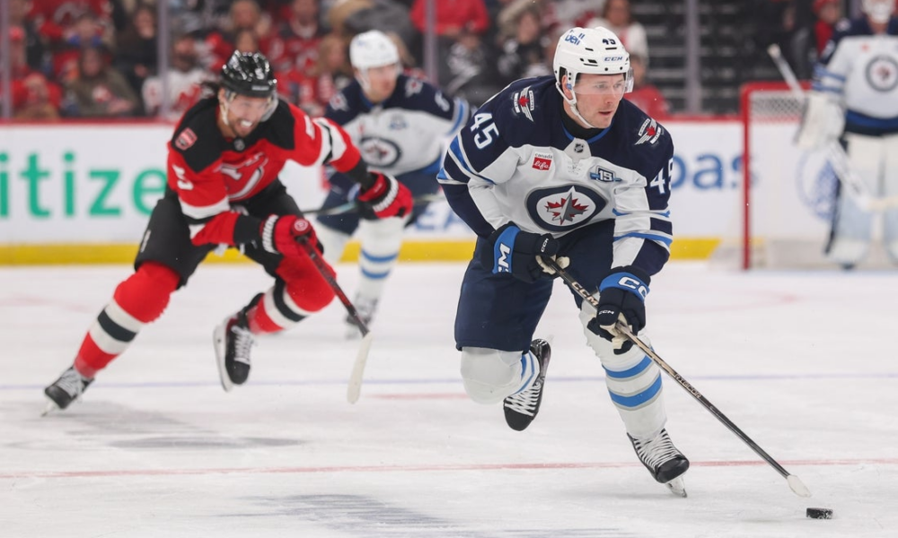 Jan 27, 2026; Newark, New Jersey, USA; Winnipeg Jets left wing Cole Koepke (45) skates with the puck against the New Jersey Devils during the first...
