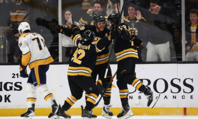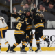 Jan 27, 2026; Boston, Massachusetts, USA; As Nashville Predators defenseman Brady Skjei (76) skates away, Boston Bruins right wing David Pastrnak (88) is congratulated by teammates...