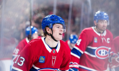 Jan 27, 2026; Montreal, Quebec, CAN; Montreal Canadiens forward Cole Caufield (13) celebrates after scoring a goal against the Vegas Golden Knights during the second period...