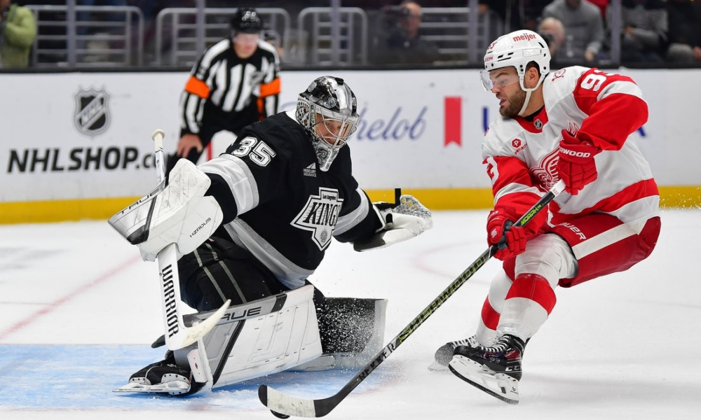 Oct 30, 2025; Los Angeles, California, USA; Los Angeles Kings goaltender Darcy Kuemper (35) blocks the shot of Detroit Red Wings right wing Alex Debrincat (93)...
