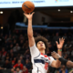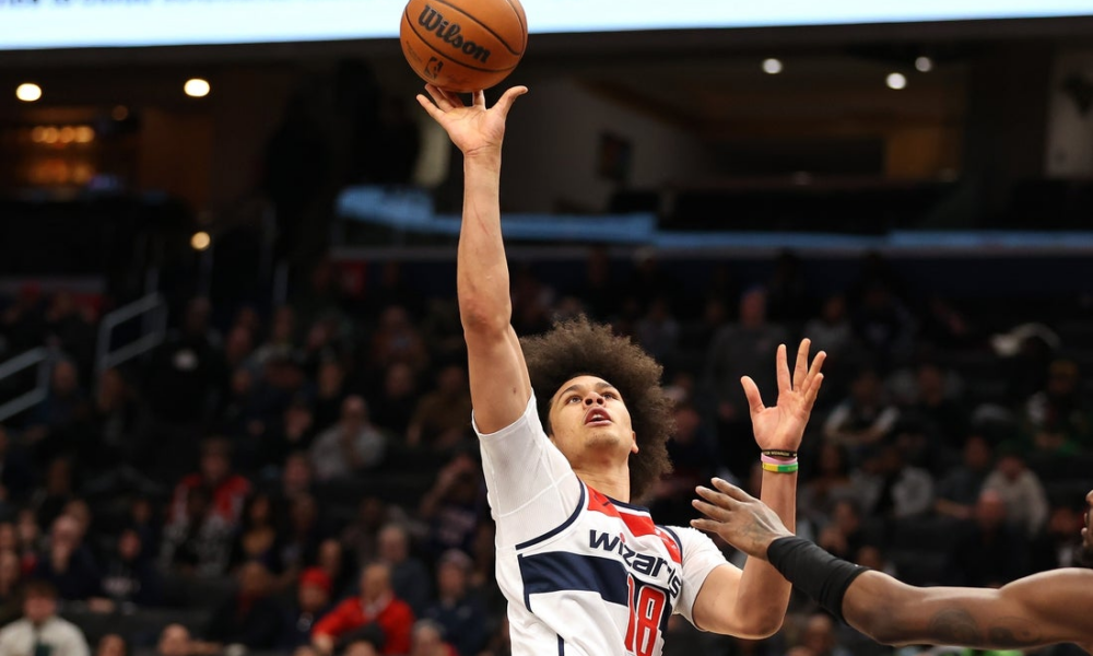 Jan 27, 2026; Washington, District of Columbia, USA; Washington Wizards forward Kyshawn George (18) takes a shot during the second half against the Portland Trail Blazers...