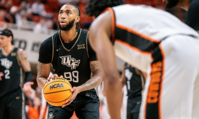 Jan 6, 2026; Stillwater, Oklahoma, USA; UCF Knights forward Jordan Burks (99) shoots a free throw during the second half against the Oklahoma State Cowboys at...