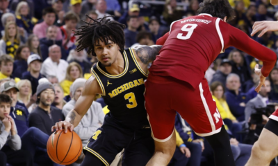 Jan 27, 2026; Ann Arbor, Michigan, USA; Michigan Wolverines guard Elliot Cadeau (3) dribbles defended by Nebraska Cornhuskers forward Berke Buyuktuncel (9) in the first half...