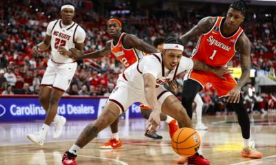 Jan 27, 2026; Raleigh, North Carolina, USA; NC State Wolfpack forward Darrion Williams (1) reaches for the ball guarded by Syracuse Orange forward Donnie Freeman (1)...