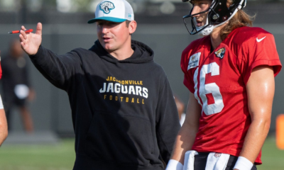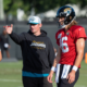 Jaguars Offensive Coordinator Grant Udinski talks with Jacksonville Jaguars quarterback Trevor Lawrence (16) during the Jaguars 14th NFL training camp session at Miller Electric Center Tuesday...