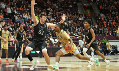 Jan 27, 2026; Blacksburg, Virginia, USA; Georgia Tech Yellow Jackets guard Lamar Washington (1) drives toward the basket as Virginia Tech Hokies center Christian Gurdak (32)...