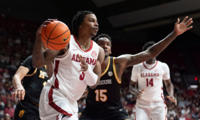 Jan 27, 2026; Tuscaloosa, AL, USA; Alabama guard Latrell Wrightsell Jr. (3) makes a run along the baseline and is defended by Missouri center Shawn Phillips...