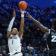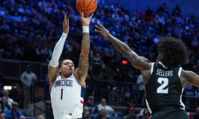Jan 27, 2026; Storrs, Connecticut, USA; UConn Huskies guard Solo Ball (1) shoots the ball against Providence Friars guard Jaylin Sellers (2) in the first half...