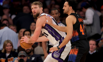Jan 27, 2026; New York, New York, USA; Sacramento Kings forward Domantas Sabonis (11) controls the ball against New York Knicks guard Landry Shamet (44) during...