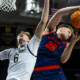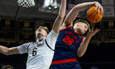Jan 27, 2026; South Bend, Indiana, USA; Virginia Cavaliers forward Thijs de Ridder (28) grabs a rebound away from Notre Dame Fighting Irish forward Brady Koehler...