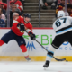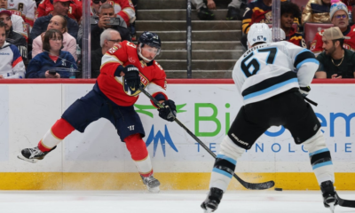 Jan 27, 2026; Sunrise, Florida, USA; Florida Panthers left wing Brad Marchand (63) moves the puck as Utah Mammoth left wing Lawson Crouse (67) defends during...