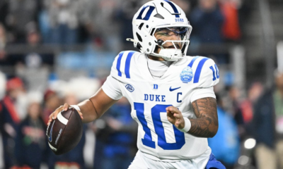 Dec 6, 2025; Charlotte, NC, USA; Duke Blue Devils quarterback Darian Mensah (10) looks to throw in the second quarter against the Virginia Cavaliers during the...