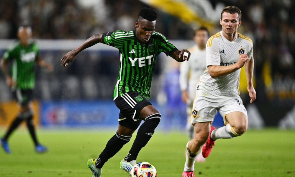 Oct 5, 2024; Carson, California, USA; Austin FC forward Jader Obrian (11) controls the ball against LA Galaxy defender John Nelson (14) in the first half...
