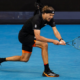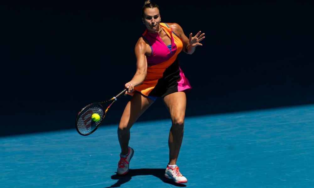 Jan 25, 2026; Melbourne, Victoria, Australia; Aryna Sabalenka in action against Victoria Mboko of Canada in the fourth round of the women’s singles at the Australian...