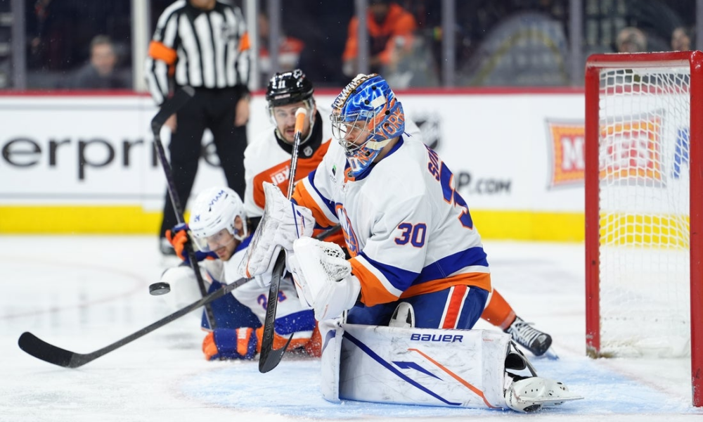 Jan 26, 2026; Philadelphia, Pennsylvania, USA; New York Islanders goalie Ilya Sorokin (30) makes a save against the Philadelphia Flyers in the first period at Xfinity...