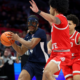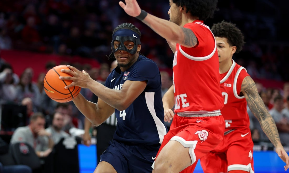 Jan 26, 2026; Columbus, Ohio, USA; Penn State Nittany Lions guard Kayden Mingo (4) looks to pass the ball as Ohio State Buckeyes guard Taison Chatman...
