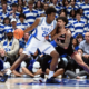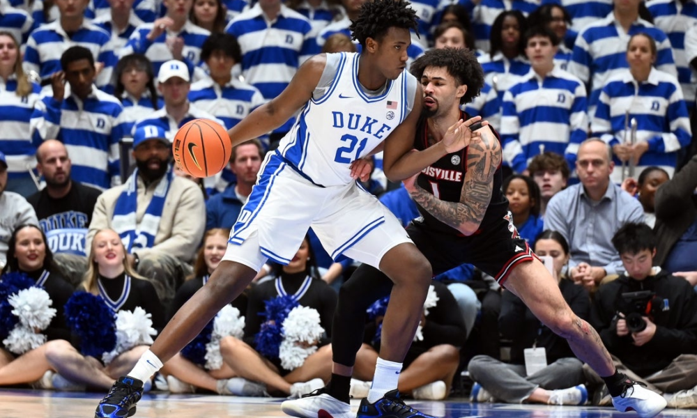 Jan 26, 2026; Durham, North Carolina, USA; Duke Blue Devils center Patrick Ngongba II (21) drives to the basket as Louisville Cardinals guard J’Vonne Hadley (1)...