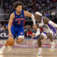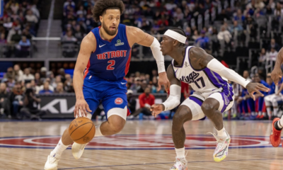 Jan 25, 2026; Detroit, Michigan, USA; Sacramento Kings guard Dennis Schroder (17) defends against Detroit Pistons guard Cade Cunningham (2) during the during the second half...